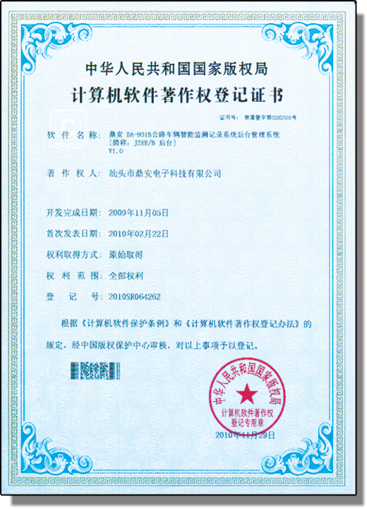 DA-931后平臺數據管理系統嚴格按照GA/T 497-2009《公路車輛智能監測記錄系統通用技術條件》、《廣東省治安卡口視頻監控系統建設規范》、GA/T 496–2009《闖紅燈自動記錄系統通用技術條件》等相關公共安全行業標準,對整個系統建設進行了詳細規劃設計,充分體現出安全、實用、合理、易維護等特點。該系統已得到國家版權局計算機軟件著作登記權證書(軟著登字第0252535號)。